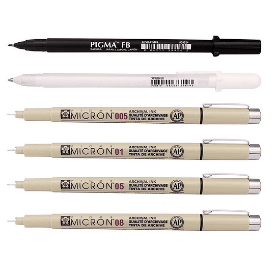 El set cuenta con 4 grosores diferentes de Pigma Micron, para valorizar contornos, sombras odistintos elementos. Además trae el Pigma Brush FB (Grosor Fino), un plumón de punta flexible como pincel que permite crear líneas que cambien de grosor sólo con cargar mas o menos su punta. Finalmente, el set trae un Gelly Roll blanco, para crear luces, zonas más iluminadas o superficies blancasuna vez ya hechas las partes con negro.
